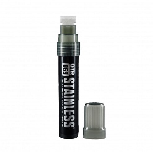 0.8" tips, ink marker- This innovative new marker offers a blend of silver pigment and permanent black ink, resulting in a smooth satin Stainless ink. The marker comes with a flat nib, larger than the original OTR.070 marker. Pump-system marker and refillable with the ink of your choice.